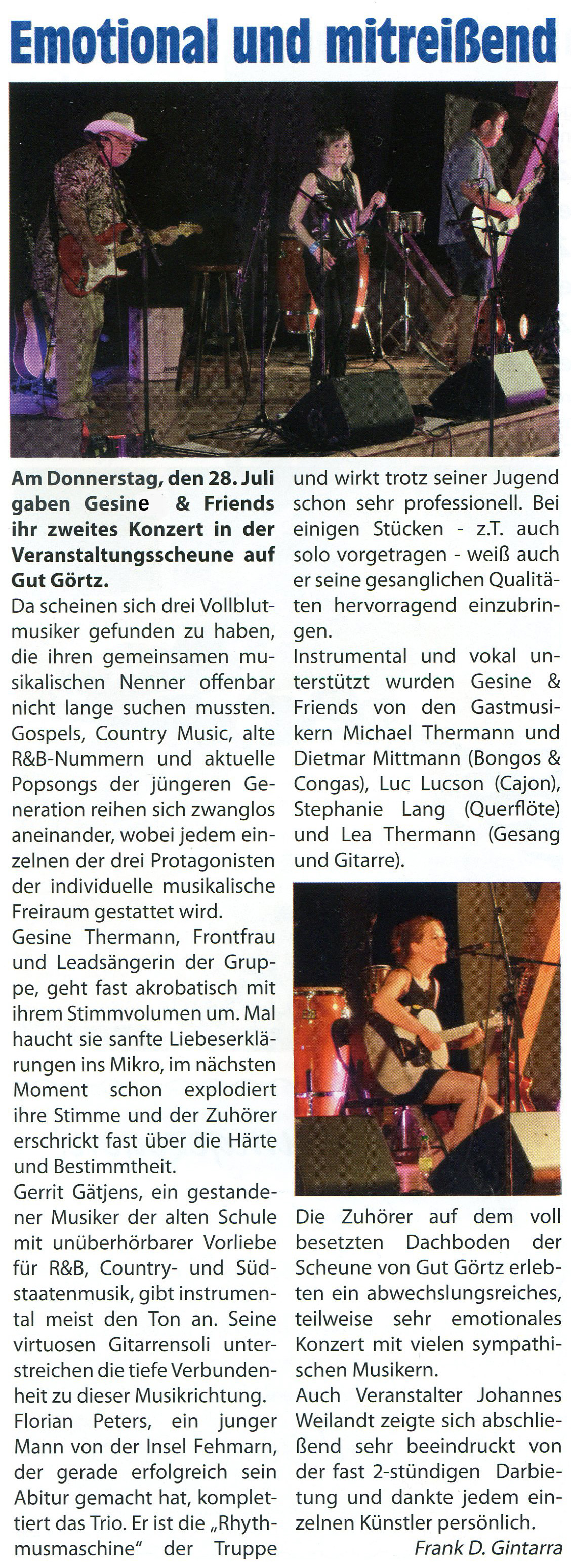 Folk und Rock, Soul und Gospel sind die Säulen, auf denen Gesine Thermann & Friends ihr musikalisches Programm bauen. Gesine ist bereits vielen als ausdrucksvolle Solosängerin des Holy Harbour Gospel Choir bekannt. In dieser Trioformation wird sie von zwei Gitarristen begleitet; Gerrit Gätjens und Florian Peters weben mit ihrem Mix aus akustischen 6- und 12-saitigen Gitarren, E-Gitarren und anderen Saiteninstrumenten sparsame, aber dennoch – oder vielleicht gerade deswegen - gehalt- und gefühlvolle Arrangements. Dabei versteht der erfahrene Gitarrist Gerrit es, mit seinem unverkennbarem Gitarrensound in einen emotionsstarken Dialog mit der Gesangsstimme zu treten. Gitarrist und Sänger Florian überzeugt besonders durch eine für seine jungen Jahre erstaunliche Professionalität und sorgt dafür, dass neben vielen Klassikern auch aktuelle Songs im Repertoire ihren Platz finden.